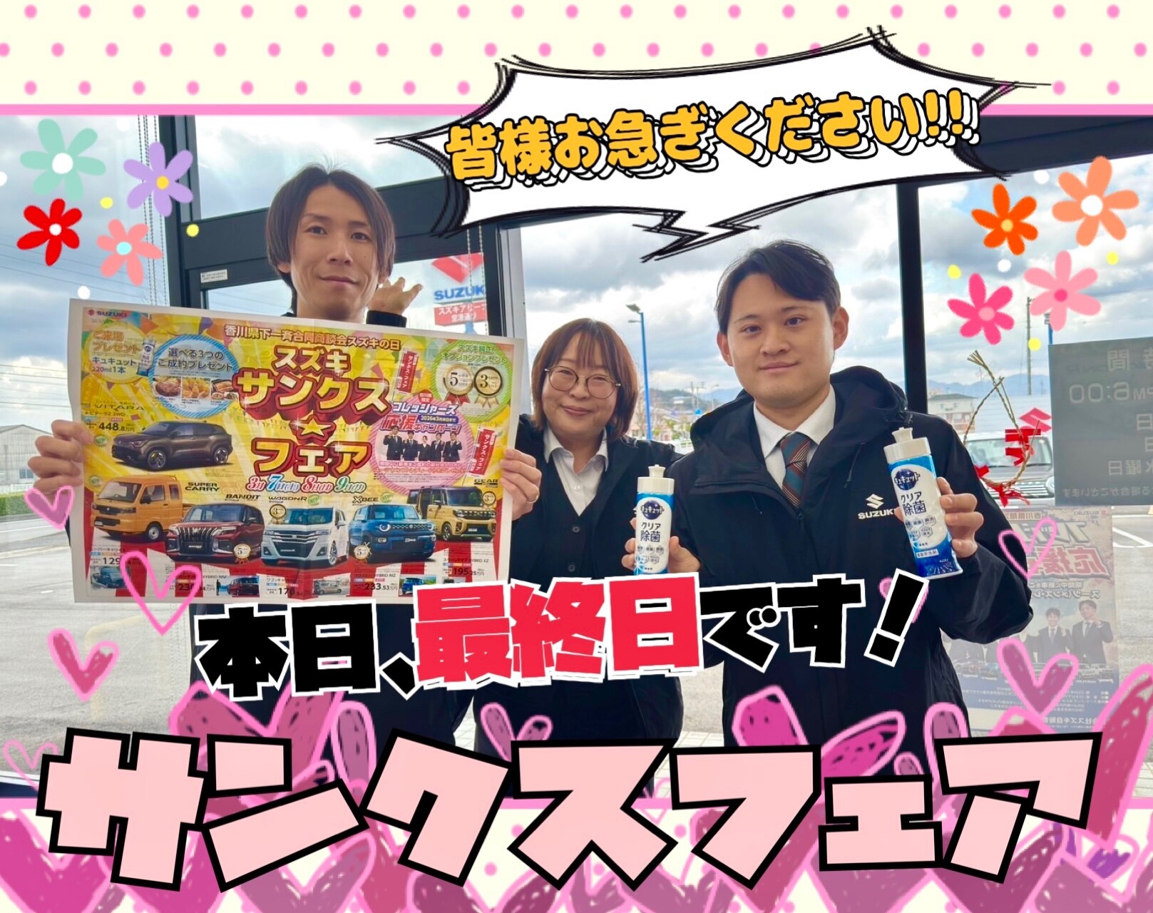 イベント/キャンペーン 2026.03.09 サンクスフェア本日 最・終・日!!!!! こんにちは アリーナ空港通り店 サービスよこざわです いつもブログをご覧いただきありがとうございます。 今日は、3月9日(サンキューの日) サンクスフェア最終日ですーーーーーーー 皆様お急ぎくださいーーー!! お得な特典はすべて今日限りです!!! 新 型 ビ タ ー ラ の試乗車あります!!!! たくさんお問い合わせいただいております お車のご購入はぜひこのお得な期間に 今年度最後ですよー! 本日も皆様のご来店心よりお待ちしております