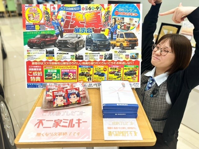 イベント/キャンペーン 2026.03.06 決算展示会開催中~!! ※このイベントは終了しました こんにちは! いつも当店のご利用ありがとうございます 決算展示会 開催しております! この期間限定のプレゼントが盛りだくさん! 期間中ご来場で 不二家ミルキーをプレゼント! ※なくなり次第終了です 期間中新車・中古車をご成約で 選べるカタログギフトをプレゼント! また、スズキ自販松山限定の特典が盛りだくさん! 詳しい内容については 下記、写真をタップしてご確認ください!! プレゼント盛りだくさんなこの機会に ぜひ、お越しください(^▽^)/