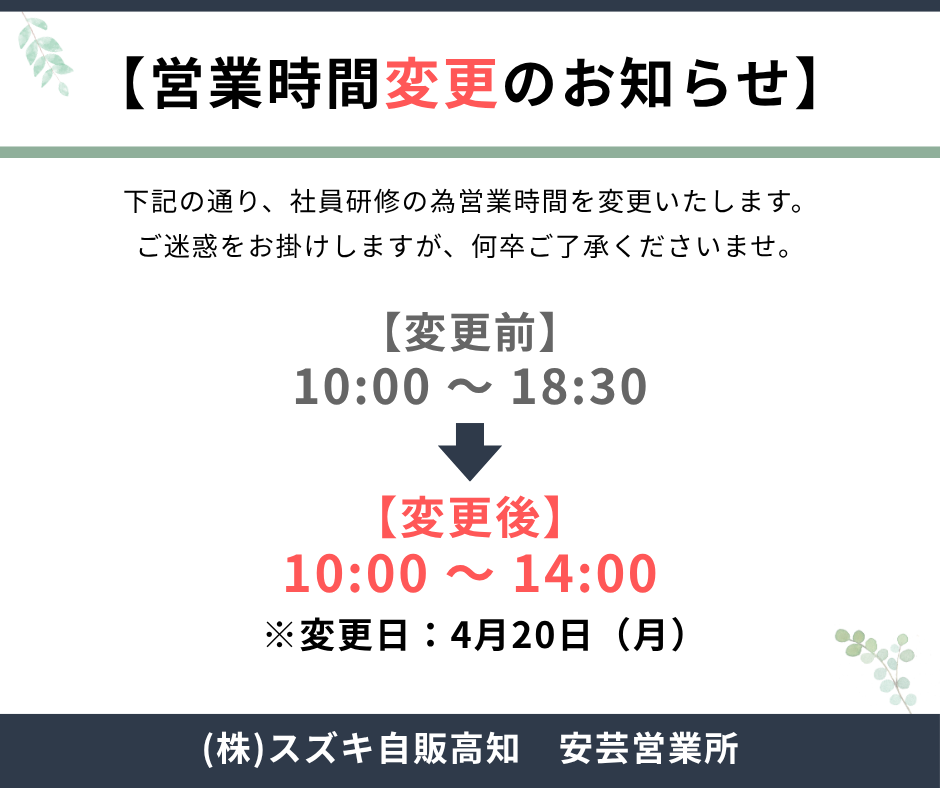 その他 2026.04.17 4月20日(月)営業時間変更のお知らせ いつもHPをご来店いただき 有難うございます。 本日は4月20日(月)の営業時間の変更のご案内です。 誠に勝手ではございますが 4月20日(月)は社内行事のため 営業時間を10:00~14:00と変更させていただきます。 また、4月21日(火)は定休日となっており、 4月22日(水)からは通常通り営業いたします。 ご理解の程よろしくお願いいたします。