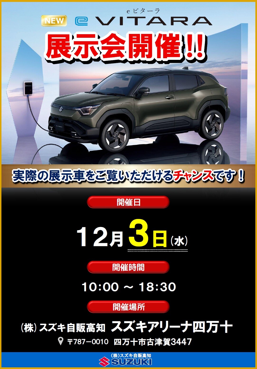 イベント/キャンペーン 2025.11.22 お待たせしました!!あのEVが四万十に! 皆さまお待たせしました! 2026年RJCカーオブザイヤー”特別賞”を受賞しました スズキ待望のEV eビターラが いよいよアリーナ四万十に降臨します まずはイベントのご案内となりますが、 随時情報を公開してまいりますので、 アリーナ四万十HPをチェックをお願いします