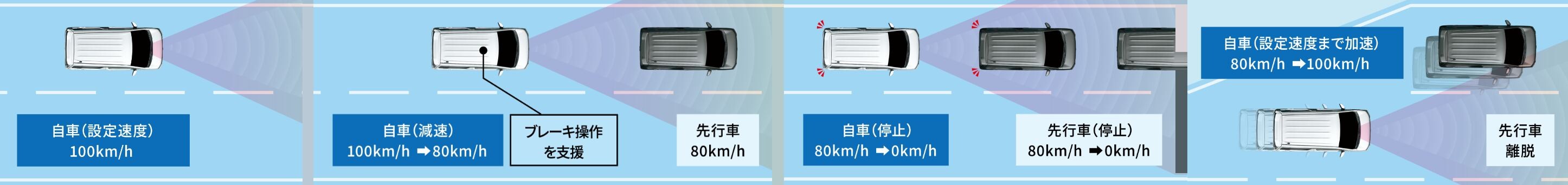 約80km/h以上で走行中に追い越し車線側へ車線変更する場合、方向指示レバーの操作と連動し、自動で加速することで、スムーズな追い越しを補助します。また、自車より遅い車両の後方へ車線変更する場合、方向指示レバーの操作と連動し、自動で減速することで、安全な合流を補助します。