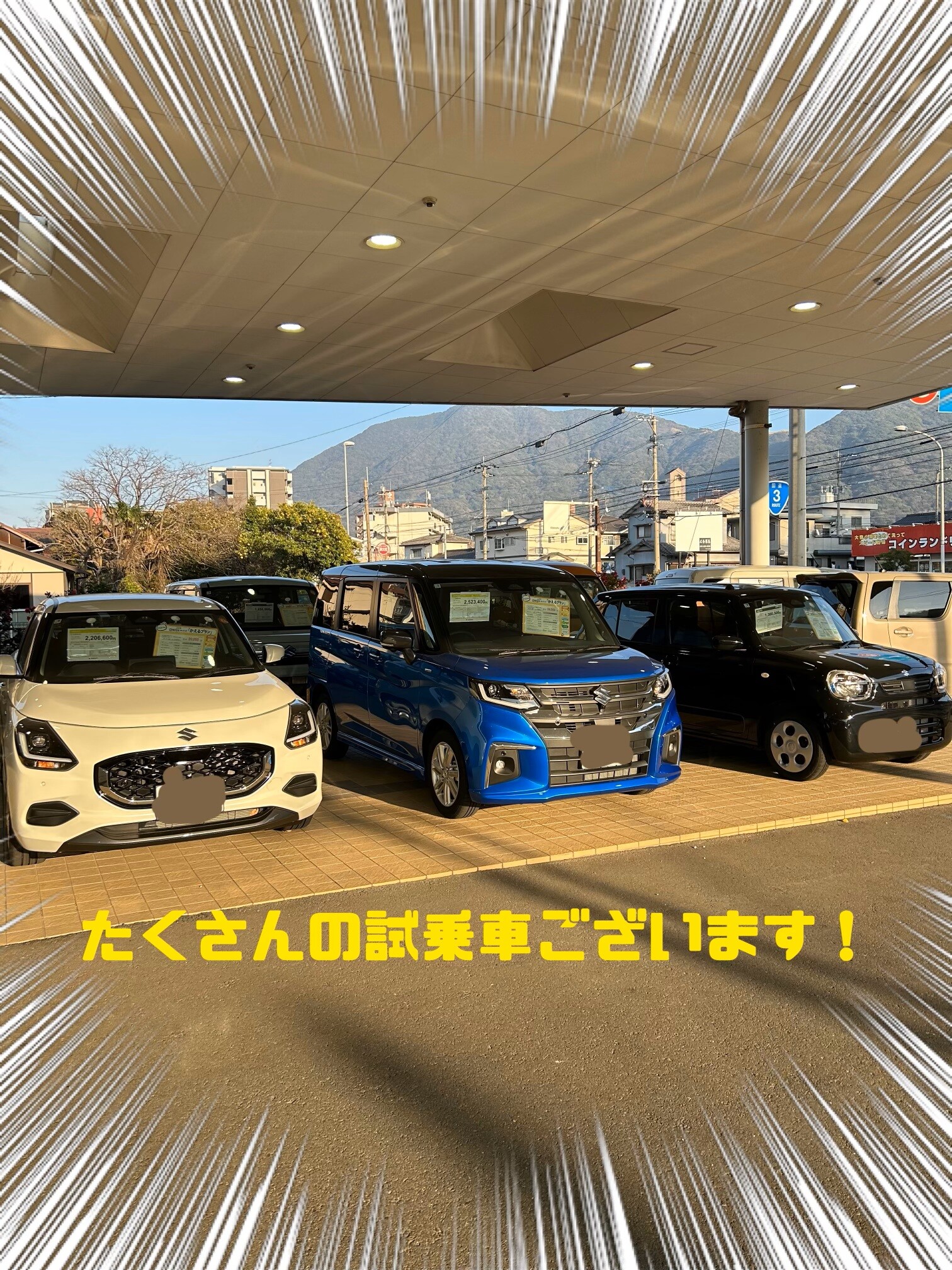 ソリオやフロンクス、スペーシア、ハスラーなど小型車から軽自動車まで数多くの試乗車がございますのでこの機会にお車を試乗してみて下さい!!