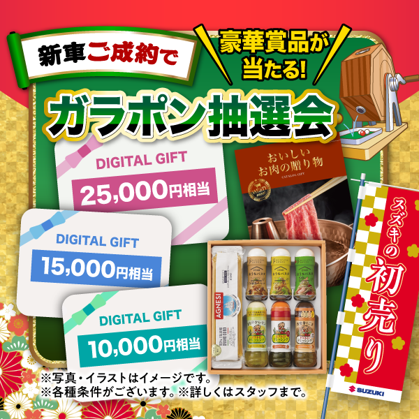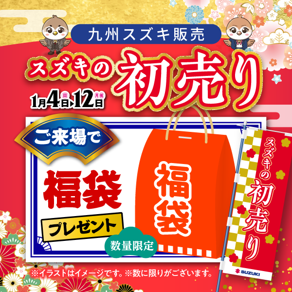 その他 2026.01.04 新年あけましておめでとうございます! 新年あけましておめでとうございます 八幡西営業所です 2026年も元気に営業いたします! 初売りは1月4日~12日迄! 今年もよろしくお願いいたします 今年も福袋をたくさんご準備してお待ちしております! ※数に限りがございます。 ご試乗・査定でピエトロドレッシングプレゼント!! オプションプレゼントも開催中! 詳しくはスタッフまで!! ご成約の方にガラポン抽選開催!! 素敵な景品をご準備しておきます!! 初売りは是非!! 九州スズキにお立ち寄りください!! 本年もよろしくお願い申し上げます!!