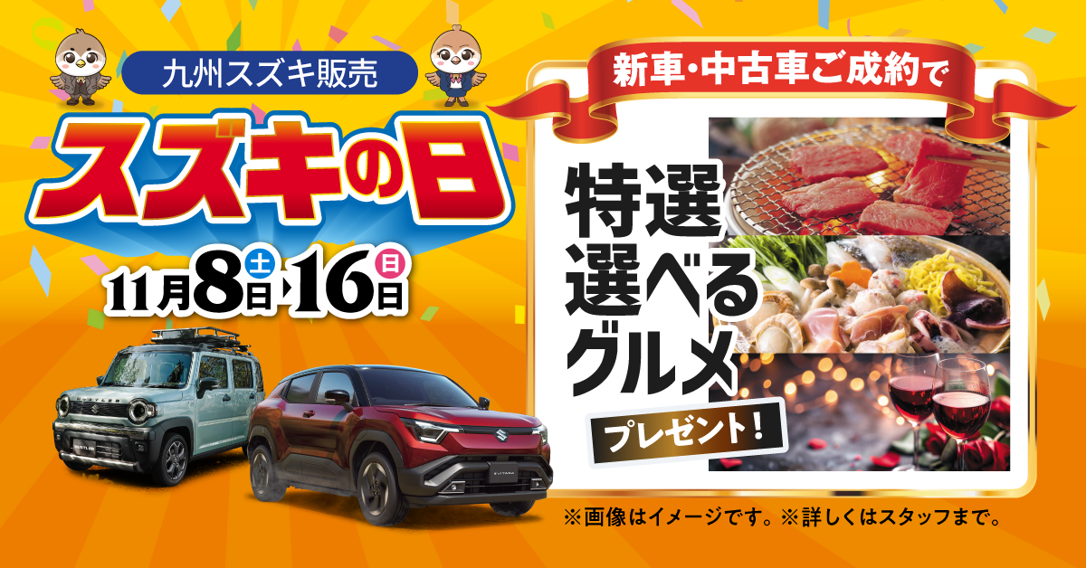イベント/キャンペーン 2025.11.08 スズキの日始まります!! こんにちは!! キハラです!! お得にご購入できるイベントがまたまたやってきます!! 開催期間は、本日11月8日(土)~16日(日)までの期間です!! ※11月11日は定休日です 対象の新車ご成約で! スズキ純正オプション 小型車10万円 軽乗用車・スペーシアベース5万円 プレゼント!! さらに豪華プレゼントも!! 詳しくは店頭スタッフまでお尋ねください!! 皆さまのご来店お待ちしています!!