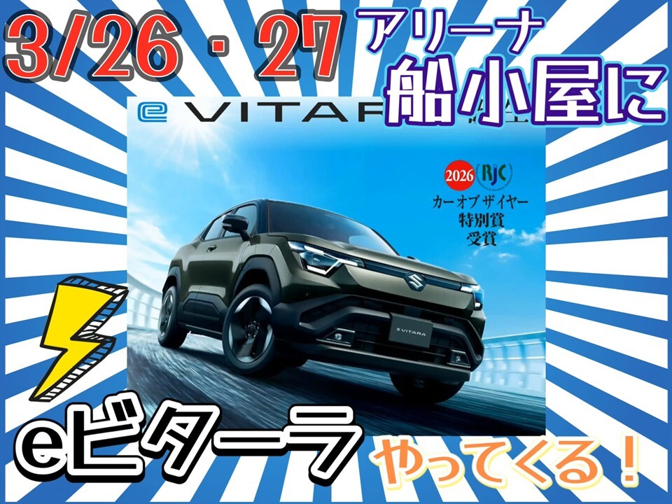 イベント/キャンペーン 2026.03.23 ぜひみにきてください! キャンペーン期間:2026.03.26~2026.03.27 皆さまこんにちは! いつも当店のホームページを ご覧いただきまして ありがとうございます! スズキ初めての電気自動車 eビターラ がアリーナ船小屋へ 3月26日(木)27日(金) 試乗車としてやってきます! 試乗予約もお電話で ドシドシ 承っております! 皆さまのお越しを お待ちしております!!
