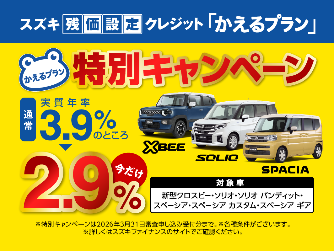 イベント/キャンペーン 2026.01.04 スズキの初売り2026‼本日よりスタート☆彡 あけましておめでとうございます 本年もスズキアリーナきやまを ご愛顧宜しくお願い申し上げます 年末年始休業を頂いておりましたが、 本日より、 スズキの初売り2026 スタートです 特典盛りだくさんで 皆様のご来店お待ちしております スズキ残価設定クレジット \かえるプラン/ 特別金利キャンペーン 実質年率 通常3.9%→2.9%‼ 車種限定 〈新車〉 新型クロスビー・ソリオ・ソリオバンディット スペーシア・スペーシアカスタム・スペーシアギア 2026年3月31日お申込み分まで 詳しくはこちら▶かえるプラン ご購入の相談アリーナきやまへお任せ下さい