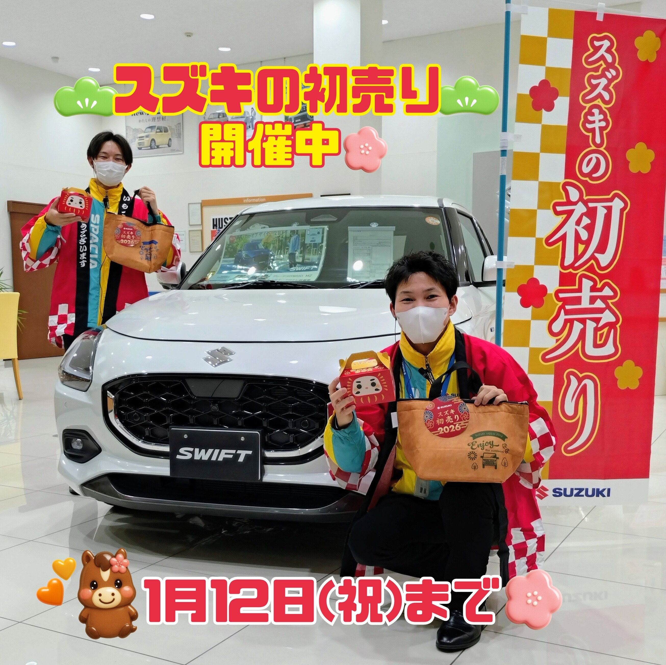 イベント/キャンペーン 2026.01.10 スズキの初売り2026開催中‼1/12(祝)まで‼ スズキの初売り 開催中です 新車ご成約特典 対象の中古車 対象中古車はこちら▶目玉車 ご来場プレゼント 1/12(月・祝)までの特典です ご来店お待ちしております ご来店予約▶お車の購入についてのご相談 ご試乗予約▶ご試乗