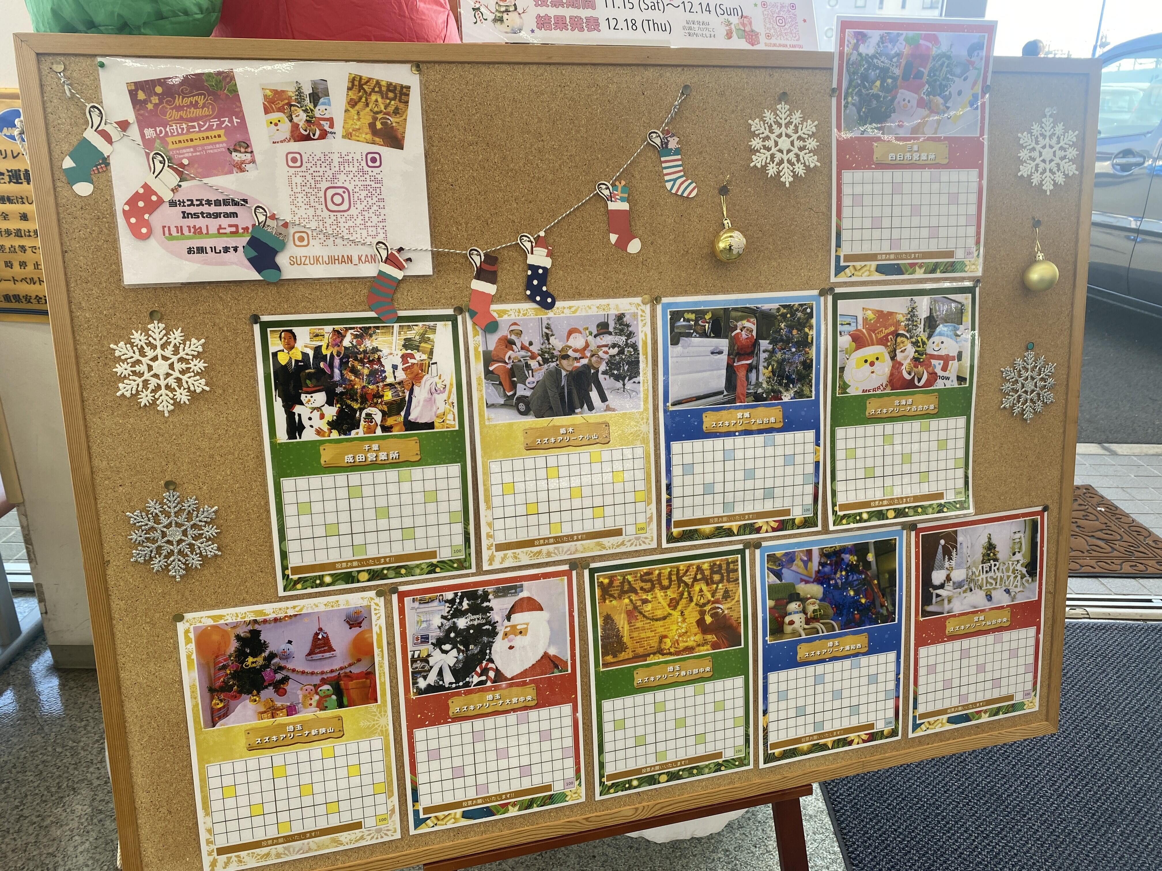 イベント/キャンペーン 2025.11.20 四日市営業所に清き一票を! キャンペーン期間:2025.11.15~2025.12.14 いつも当社のホームページをご覧いただき誠にありがとうございます。 営業のうえだです 最近急に寒くなってきましたね 皆様風邪にはお気を付けください! 改めて今日は先日から始まっているクリスマス飾り付けコンテストのご紹介! このように店頭に貼り付けてありますので皆様どしどし参加願います スズキマイページの登録後、3票まで拠点の飾り付けに投票できます。(1拠点につき1票まで) 投票いただきましたら、お菓子を用意しておりますので1つお持ち帰りください よろしくお願いします