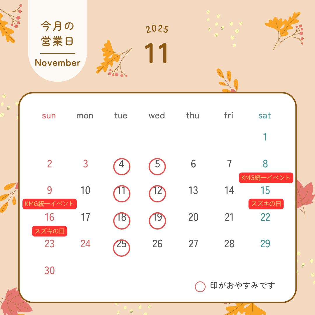 その他 2025.10.31 11月のイベント・休日のお知らせ 11月イベント・休日のご案内です! 11/8(土)・9(日)は、KMG統一イベント 来店プレゼントから豪華成約プレゼントまでご準備しております(^^♪ 11/15(土)・16(日)は、スズキの日 お買い得車・試乗車多数ご準備してお待ちしております お得な期間になってますので是非この機会にご来店くださいませ スタッフ一同お待ちしております! 西九州スズキ自動車販売株式会社 アリーナ多良見店 諫早市多良見町囲444 ☎0957-27-2229