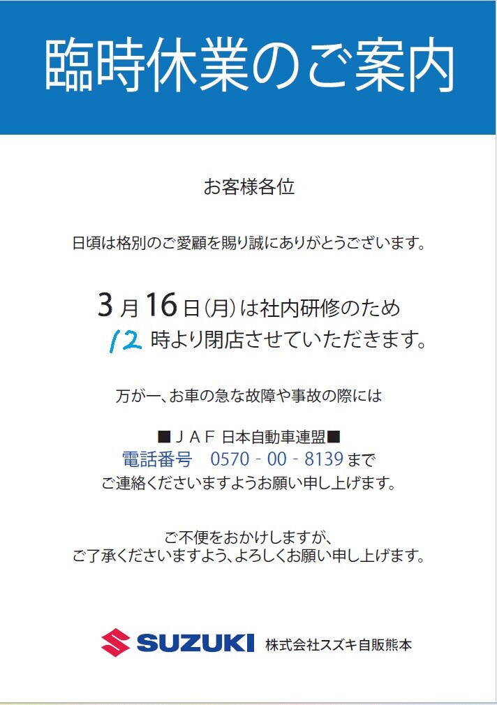 その他 2026.03.12 ★臨時休業のご案内★ 当店のホームページをご覧いただき 誠にありがとうございます。 誠に勝手ながら、 3月16日(月)は社内研修のため 12時にて閉店とさせて頂きます。 ※3月17日(火)・3月18日(水)は店休日です※ 万が一、お車の急な不具合などで緊急の場合は ◆JAF 日本自動車連盟◆ TEL:0570-00-8139 又は 短縮ダイヤル:#8139 まで ご連絡くださいますようお願い申し上げます。 ご不便お掛け致しますが、 ご理解のほど宜しくお願い致します。