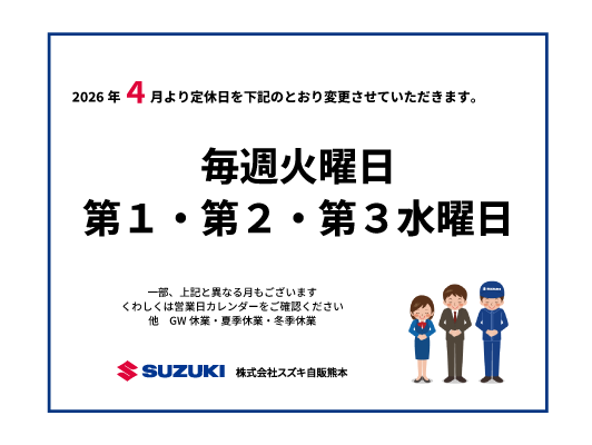 その他 2026.03.22 !! 店休日変更のお知らせ !! いつも当店をご利用いただき、誠にありがとうございます! このたび、誠に勝手ながら店休日を下記の通り変更させていただく こととなりました...! 【 変更前 】 毎週火曜日・第2・第3水曜日 【 変更後 】 毎週火曜日・第1・第2・第3水曜日 4月1日より変更となります! お客様にはご不便をおかけする場合もございますが、 より良いサービスをご提供できるよう努めてまいりますので、 何卒ご理解のほどよろしくお願いいたします! 今後とも変わらぬご愛顧のほど、 よろしくお願いいたします!