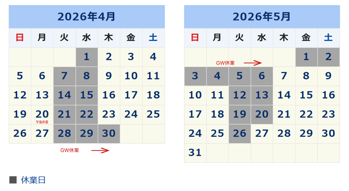 GW休業期間:2026年4月28日(火) ~ 5月6日(水・祝)