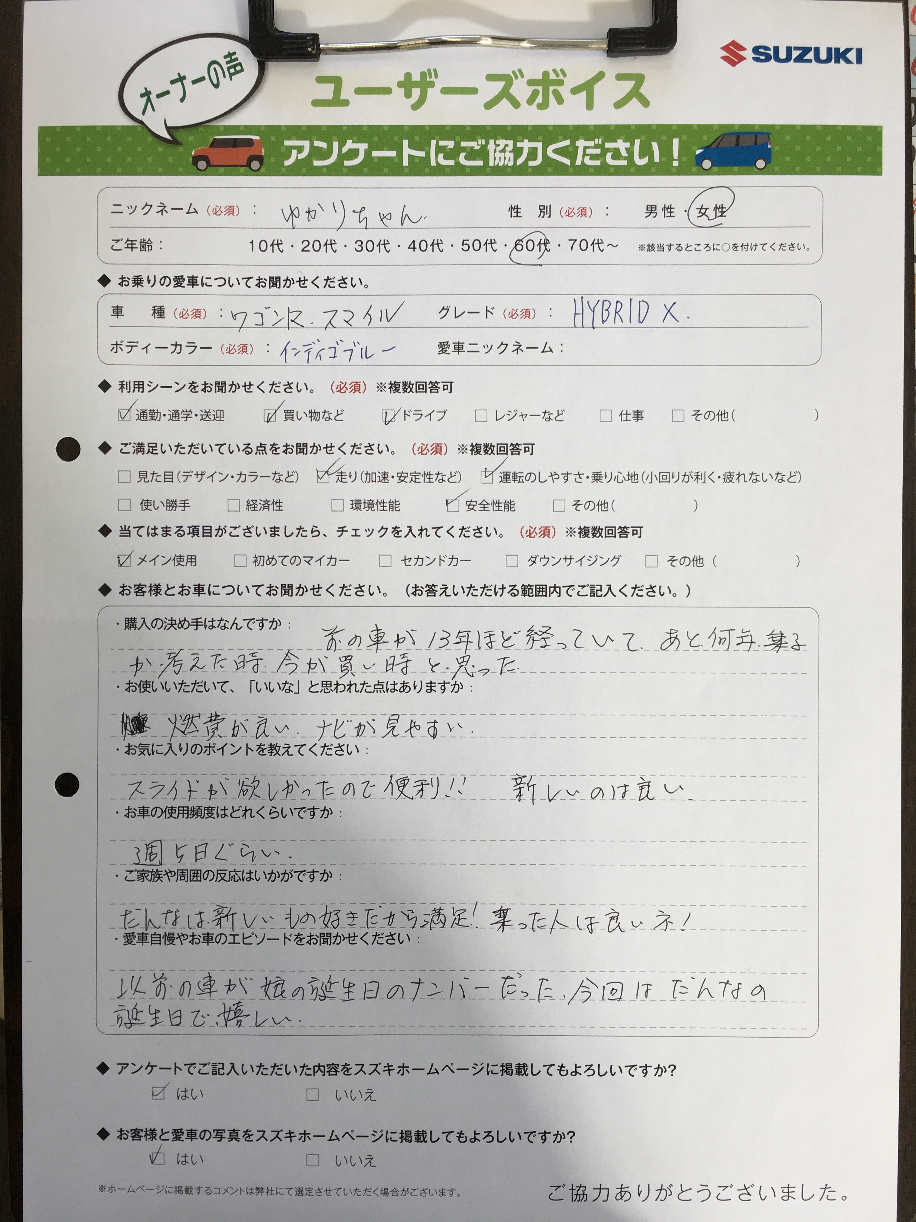 新型ワゴンRスマイル 新車1ヶ月点検時のお客様の声