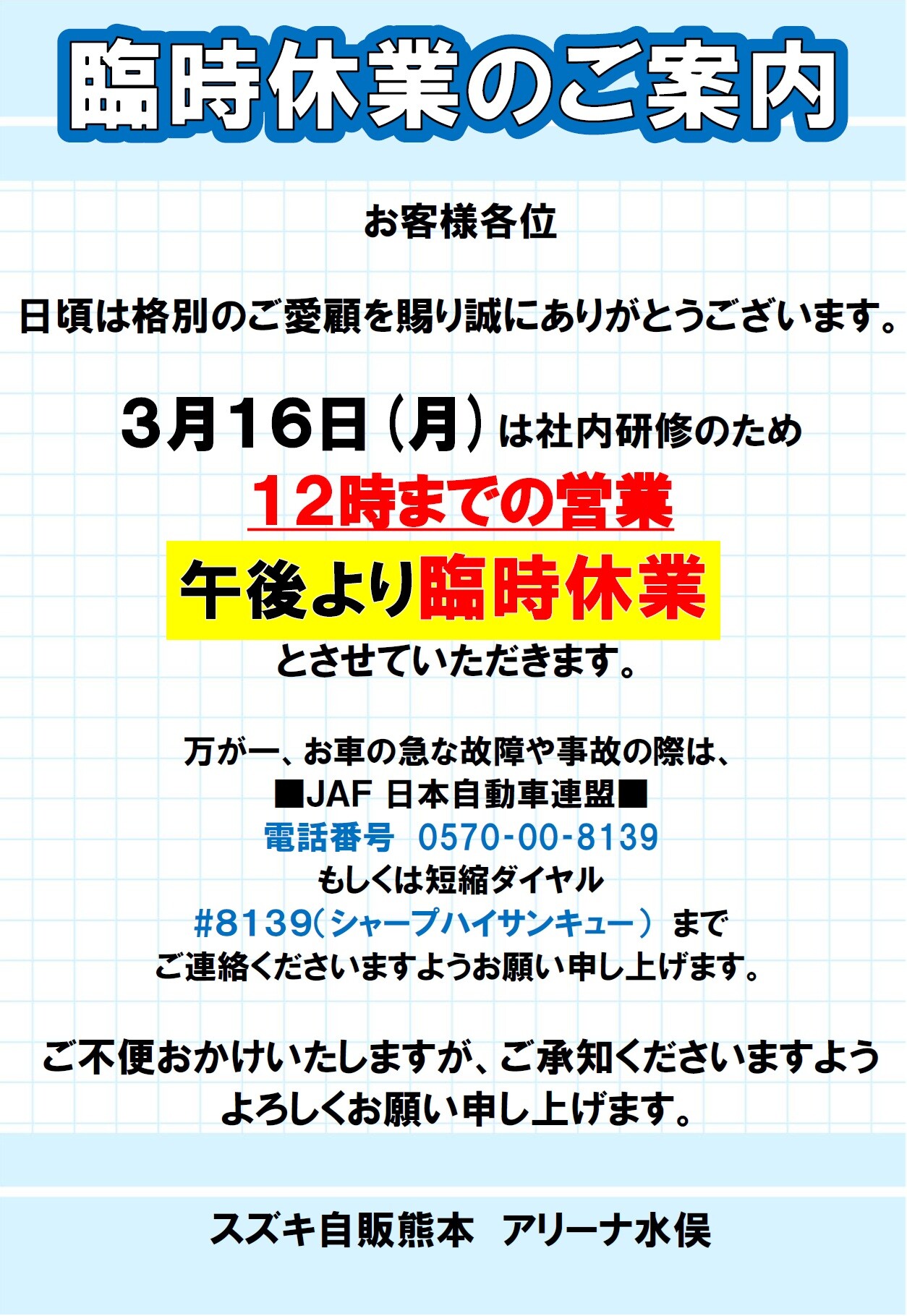 3月16日(月)臨時休業のご案内