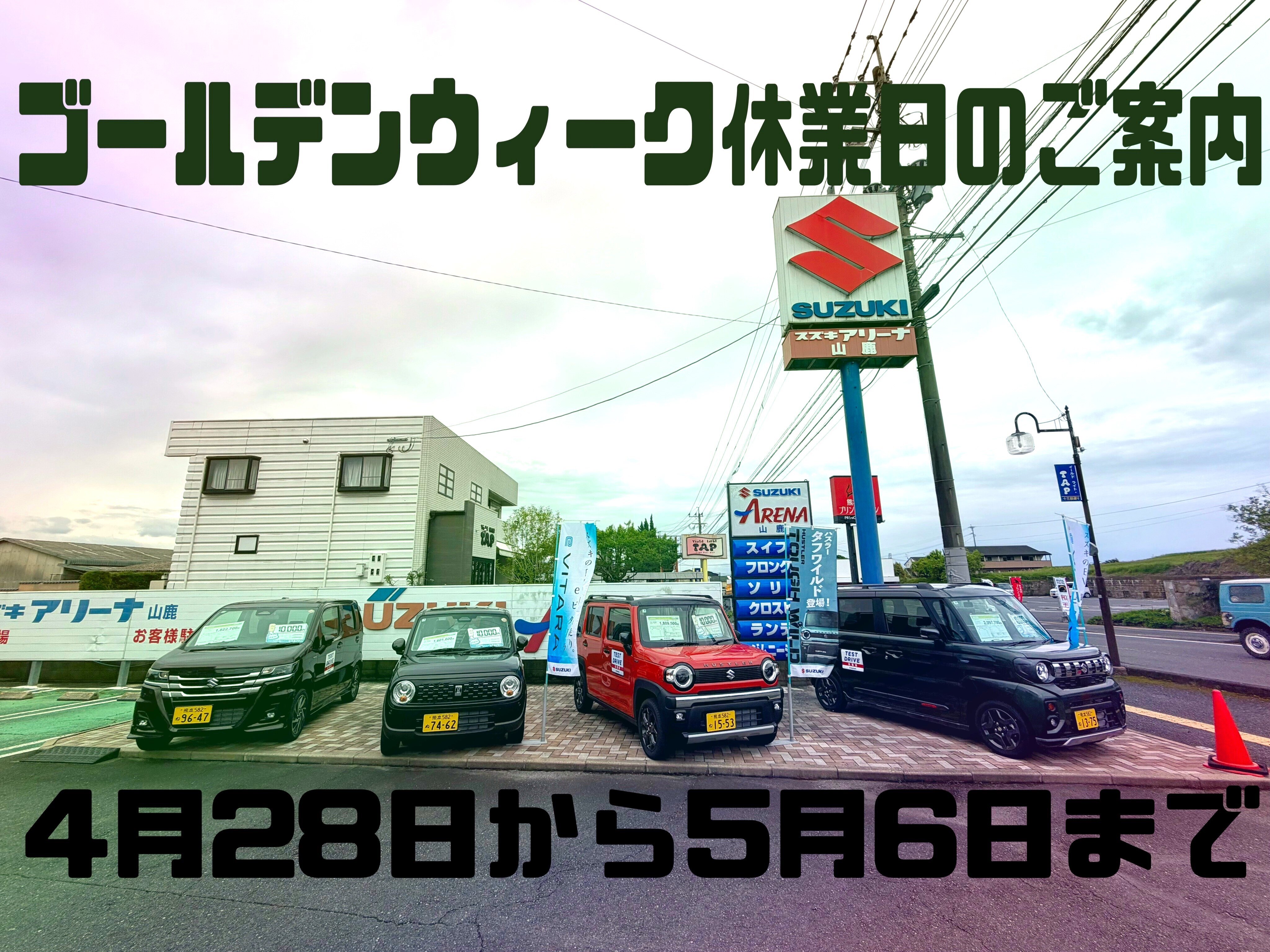 その他 2026.04.24 休業日のご案内 日頃はスズキ自販熊本をご愛顧賜りありがとうございます。 誠に勝手ながら、4月28日(火)より5月6日(水)までの期間 休業とさせていただきます。 ※店舗により、休業日が異なります。 詳しくは各店舗ブログにてご確認ください。 上記期間中、お車の急な故障や事故の際には恐れ入りますが ■JAF 日本自動車連盟■ 電話番号 0570‐00‐8139 または 短縮ダイヤル #8139(シャープハイサンキュー) まで ご連絡をお願いいたします。 株式会社 スズキ自販熊本