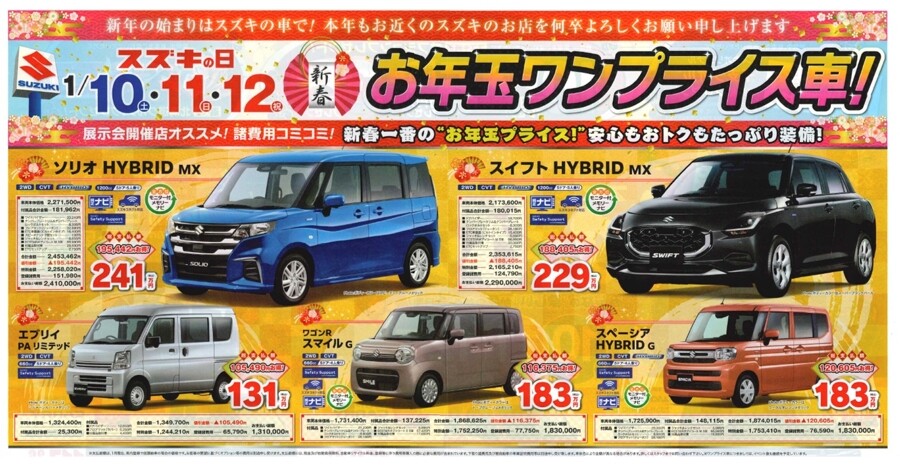 イベント/キャンペーン 2026.01.08 【スズキの日】開催! ※このイベントは終了しました 1月 10日(土) 11日(日) 12日(月) 3日間 【 スズキ 初売り フェア! 】 開催!! みなさまのご来店お待ちしております