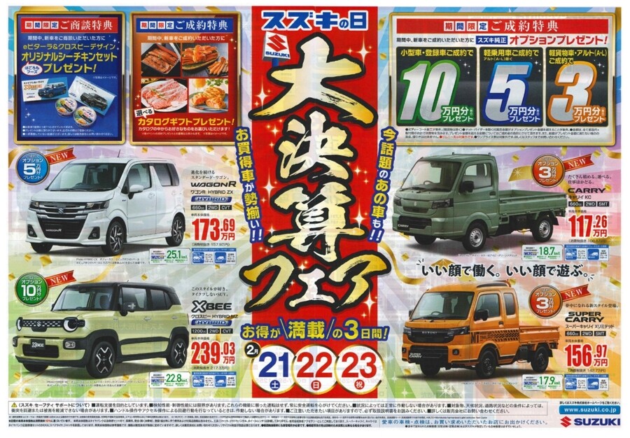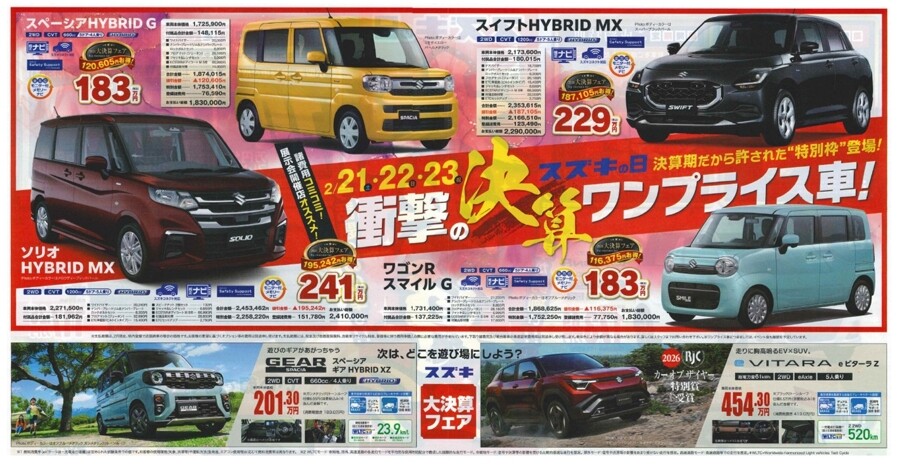イベント/キャンペーン 2026.02.19 【スズキの日】開催! ※このイベントは終了しました 2月21日(土) 22日(日) 23(月) の3日間 【 スズキの日 大決算フェア 】 開催!! 皆様のご来店お待ちしております