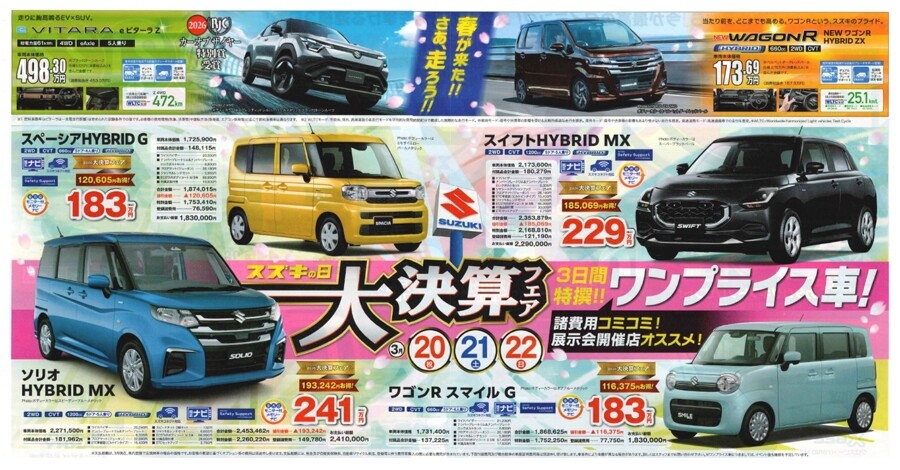 イベント/キャンペーン 2026.03.19 【スズキの日】開催! ※このイベントは終了しました 3月 20日(金) 21日(土) 22(日) 3日間 【 スズキ 大決算フェア 】 開催! 見逃せない3日間!! 皆様のご来店お待ちしております