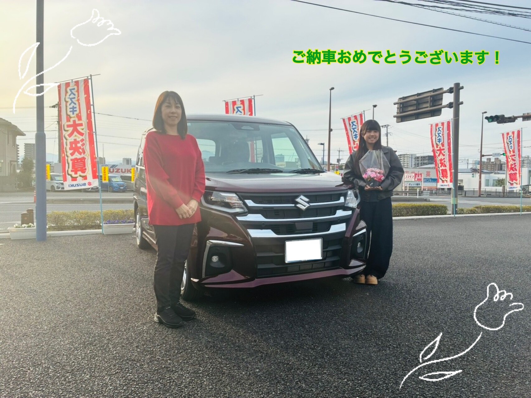 納車ギャラリー 2026.03.23 ソリオのご納車おめでとうございます。 愛車 ソリオ お客様 S様 グレード HYBRID MZ ボディーカラー メロウディープレッドパール S様 この度はソリオのご購入ありがとうございました 今まで使ったことのない機能や快適な装備を楽しんでもらえたら嬉しいです 素敵なカラーリングも特徴的ですね 今後ともよろしくお願い致します