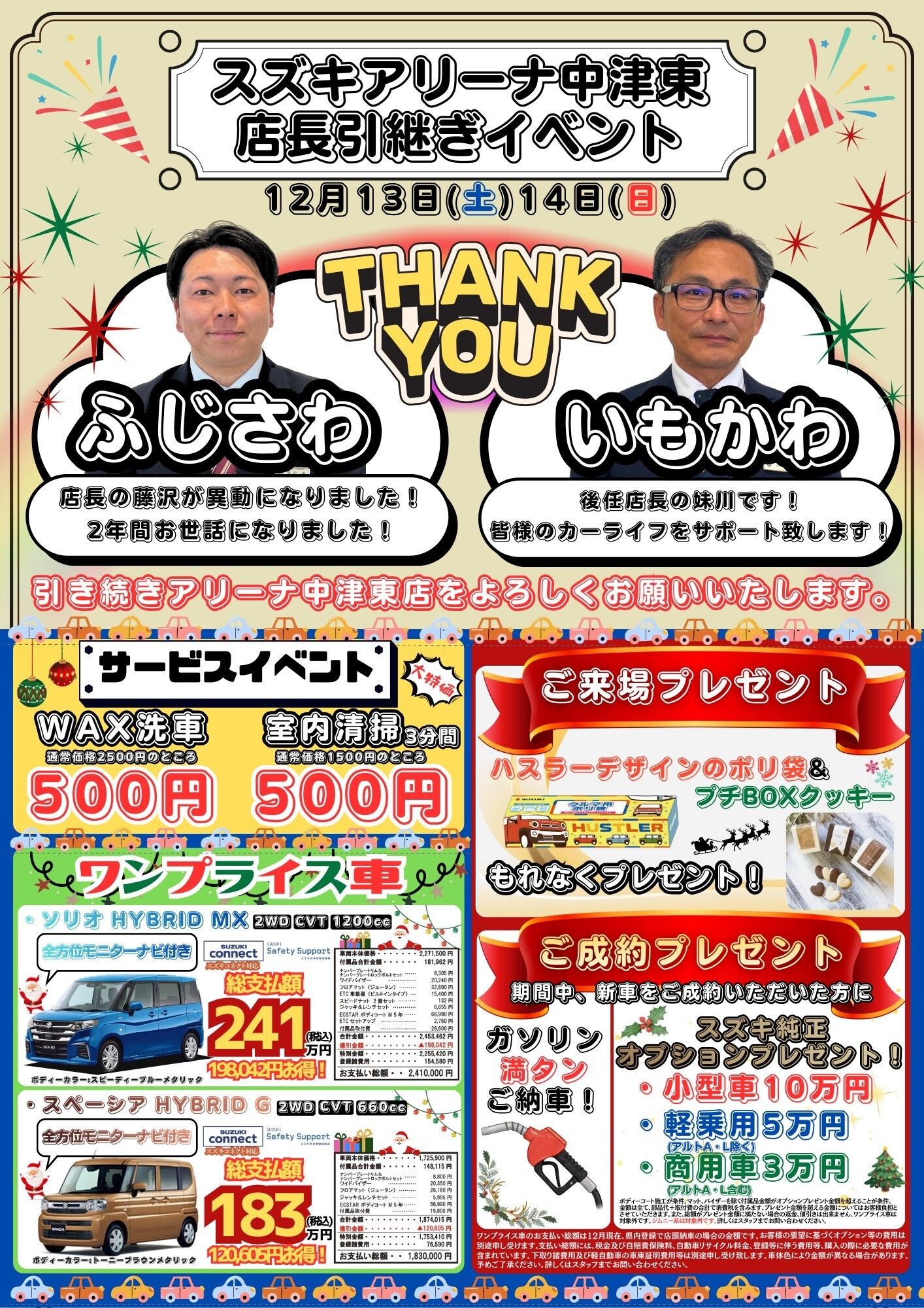 イベント/キャンペーン 2025.12.12 ☆緊急イベント実施☆ キャンペーン期間:2025.12.13~2025.12.14 皆さん毎度HPをご覧頂き誠にありがとうございます アリーナ中津東店では13日(土)14日(日) オリジナルイベントを実施致します この度中津店の店長の交代に伴い この2日間限定 1⃣ご来場プレゼントご用意してます 2⃣サービスイベント大特価 (WAX洗車、室内清掃) 3⃣新車ご成約特典 ガソリン満タン等 ※当日は混雑が予想されますので ご対応がスムーズに出来ない場合、お時間を頂く場合 がございます。 あらかじめご了承をお願いします 皆様のご来場お待ちしております