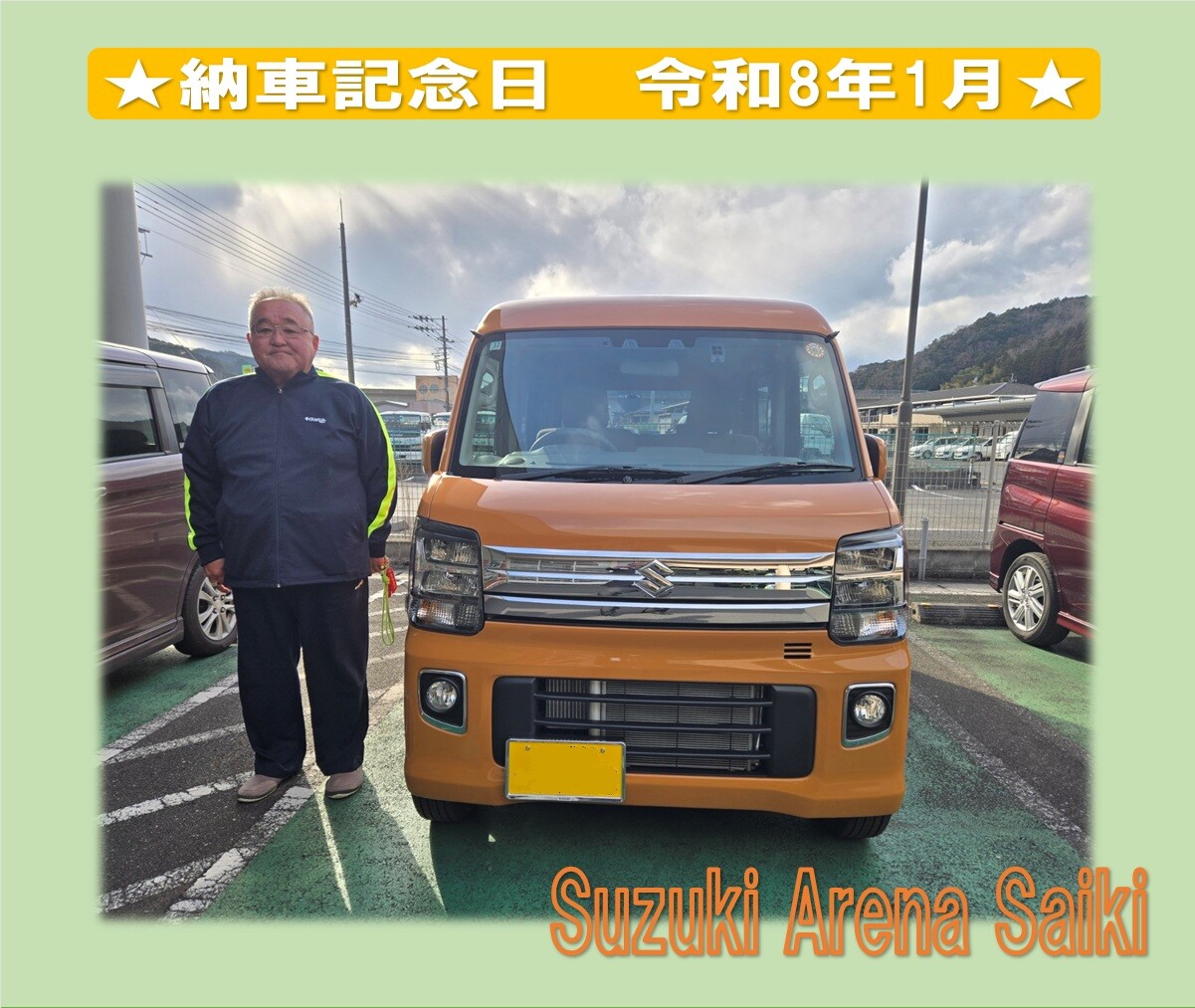 納車ギャラリー 2026.01.20 ★スズキアリーナ佐伯 納車記念日★ 愛車 エブリイワゴン お客様 Y様 グレード PZターボ スペシャル ハイルーフ ボディーカラー ツールオレンジ Y 様 納車ありがとうございました いつも楽しくお話をさせていただき ありがとうございます エブリイワゴンは使い勝手が良く 必ず満足していただけると思います! 楽しい想い出をいっぱい作って下さい これからのY様のカーライフをスタッフ一同サポートさせて頂きますので 末永いお付き合いを宜しくお願い致します スズキ自販大分 アリーナ佐伯 中川 昌治・スタッフ一同