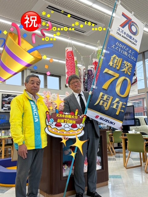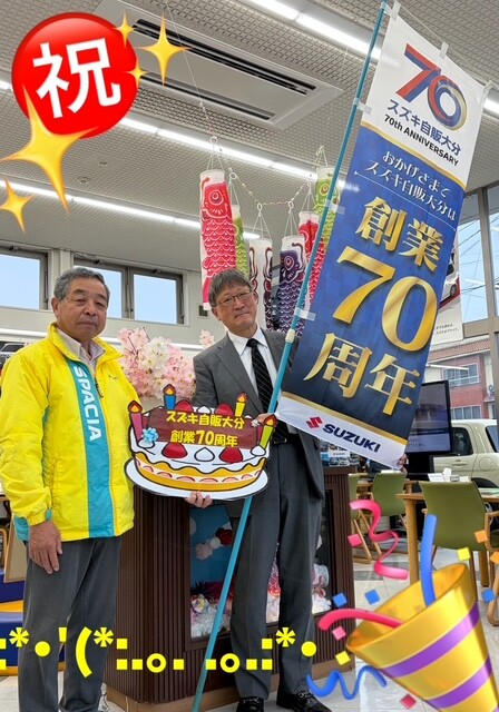 その他 2026.04.23 スズキ自販大分は創業70周年です! Happy Birthday70th スズキ自販大分は、おかげさまで創業70周年を迎える事が出来ました! これからも、皆様の為に精一杯頑張りますので、何卒宜しくお願い申し上げます。 お買い得の新車、信頼の保険商品、安心・安全の整備工場で、皆様のカーライフをスタッフ一同サポートさせて頂きます。今後とも、宜しくお願い申し上げます 皆様の、ご来店をお待ち申し上げます♪