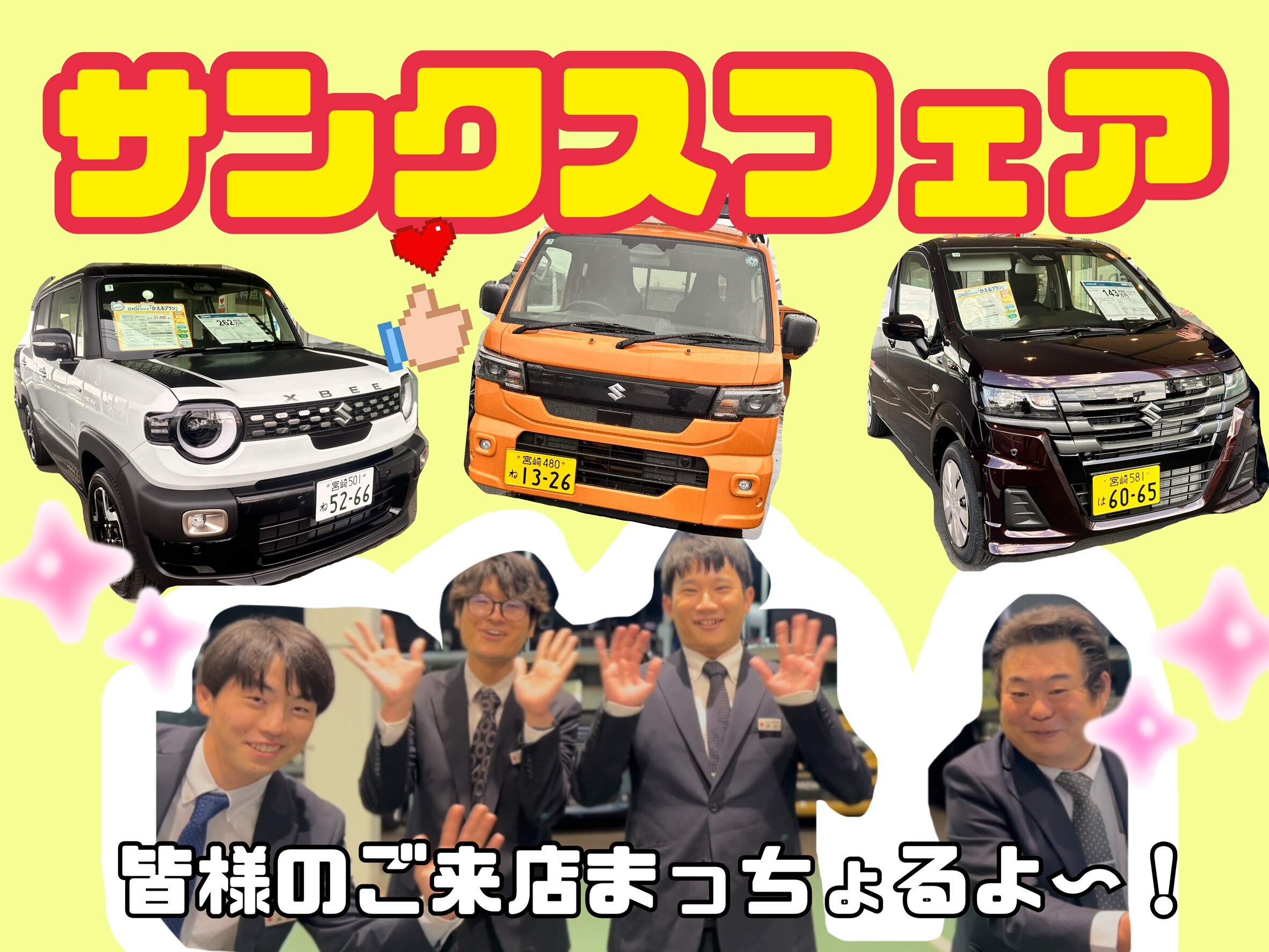 イベント/キャンペーン 2026.03.06 サンクスフェア ご来店まっちょるよ~! ※このイベントは終了しました 皆さんこんにちは! アリーナ都城中央店です いよいよ明日より9日(月)までの3日間 サンクスフェアを開催 ご来場プレゼント めぐりズムアイマスク 新車・中古車のご成約プレゼント 3つの中から選べるプレゼント さらに新車ご成約の方にはオプションプレゼントも! 保険診断会もやります!! ぜひお乗り換えのタイミングで保険内容を見直してみませんか? 皆様のご来店お待ちしております!!!