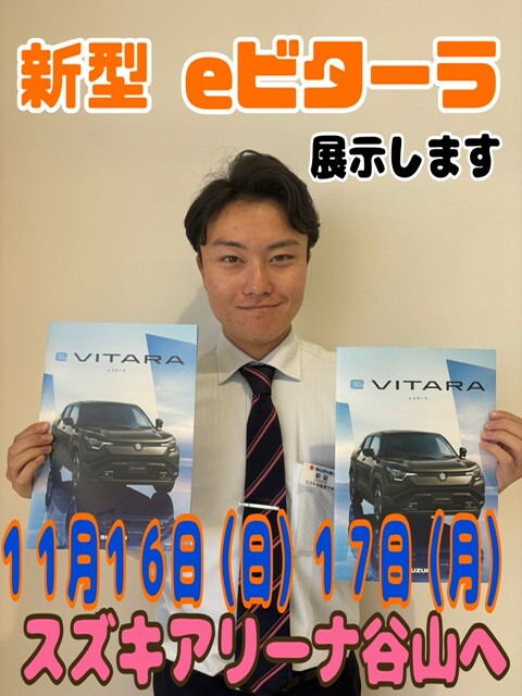 イベント/キャンペーン 2025.11.15 新型eビターラ 谷山に!! いつもアリーナ谷山のホームページを ご覧いただきありがとうございます \\スズキのEV// eビターラが 谷山へやってくる!!! 2日間限定!! ※展示のみとなります。 11/16(日)~ 11/17(月)10:00~17:00 スズキアリーナ谷山 鹿児島県鹿児島市卸本町7-4 この機会にぜひご体感ください!! ▼新型e-ビターラの特設サイトはこちら▼