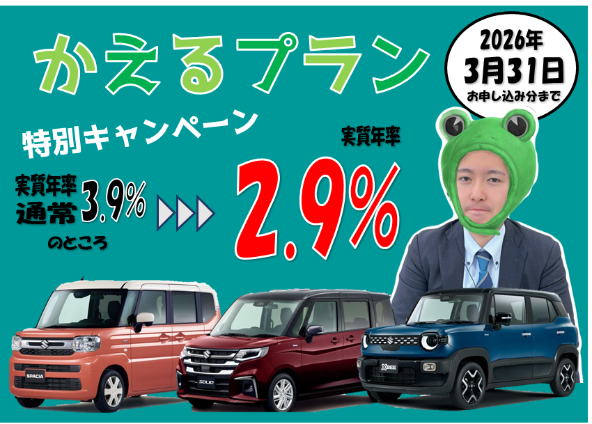 その他 2026.02.12 **かえるプラン今だけの特別キャンペーン‼** アリーナ中山のホームページをご覧いただき ありがとうございます。 スズキ残価設定クレジット かえるプラン 通常金利3.9%のところ 今だけ 2026年3月31日お申込み分まで 2.9% ☆対象車種☆ スペーシア/ スペーシアカスタム/ スペーシアギア/ ソリオ/ソリオバンディット 新型クロスビー 気になるお車がある方はこの機会にスズキにお越しください 皆様のご来店お待ちしております