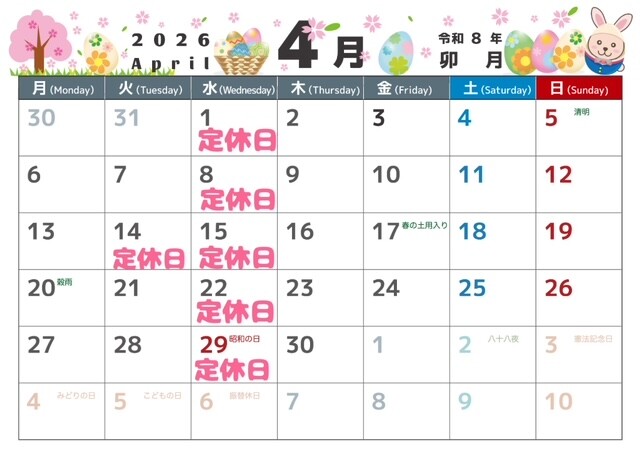 その他 2026.04.13 4月定休日のご案内 皆様こんにちは いつもホームページご覧いただき ありがとうございます。 4月が始まり 新しい生活がスタートの 皆様も多いと思います。 アリーナ鹿屋西も元気いっぱい スタートしていますよ お車のご相談お待ちしておりまーす。 4月定休日のご案内 毎週水曜日と、 4月は、14日(火)が 定休日となります。 ご不便をお掛けしますが 何卒ご理解の程よろしくお願いいたします。