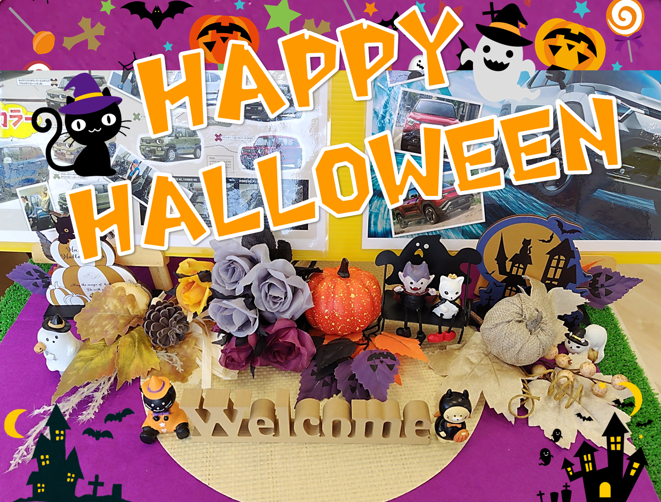 その他 2025.10.28 ハロウィンでHAPPY! U‘s STATION鹿屋東のHPをご覧頂き 誠にありがとうございます。 10月の大イベント ハロウィン お披露目が遅くなりましたが 31日まではまだ大丈夫です。 見に来て下さい。 ニューフェイスはもちろん可愛いニャンコ達 迷わず連れてきました。 あちらこちらにニャンコを配置しています。