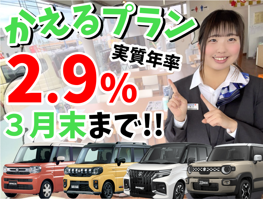 その他 2026.01.15 \残価設定クレジット/ 皆様ご存じ、あの・・・ スズキ 残価設定クレジット かえるプラン な ん と !! 『2026年3月31日まで』 実質年率3.9%のところ → 実質年率2.9% ↓ ↓ 対象車 ↓ ↓ クロスビー ←ぽちっ ソリオ (✚ソリオバンディット) ←ぽちっ スペーシア (✚スペーシアカスタム・ギア) ←ぽちっ ←ぽちっ この大チャンスにぜひ お見積・査定・ご試乗 \\ してみませんか? // スズキアリーナ指宿中央 ☎0993-25-4500