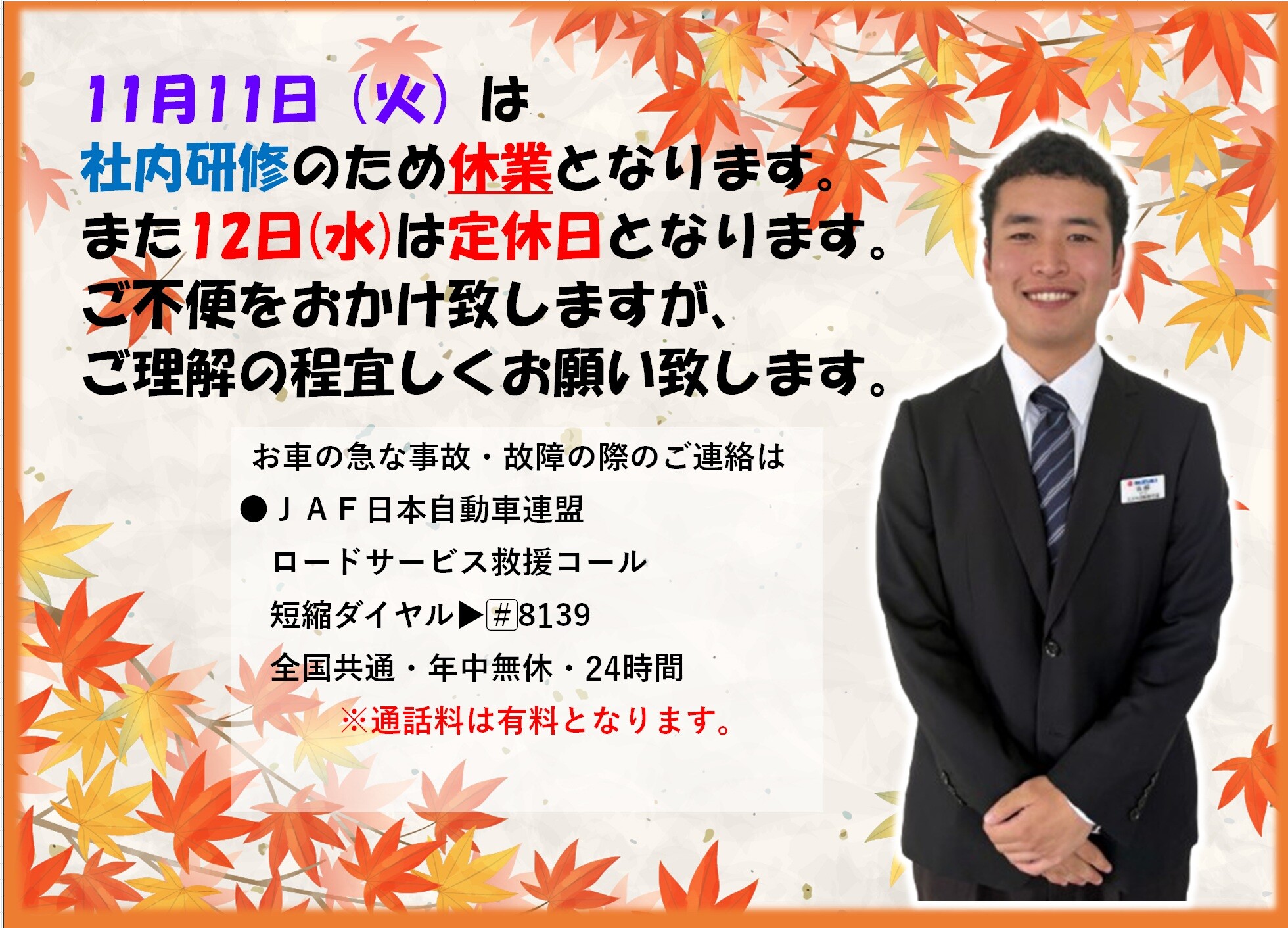 11月11日(火)は社内研修のため休業となります。