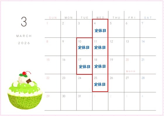 3月の定休日ご案内です