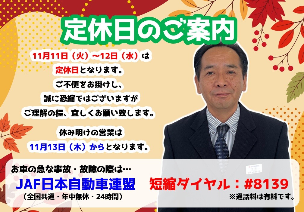 その他 2025.11.10 **定休日のご案内です** こんにちは♪ いつも大隅営業所の ホームページをご覧いただき ありがとうございます 今回は定休日のご案内です! 11月11日(火)~12日(水)は 定休日となります。 ご不便をお掛け致しますが、 ご理解の程、よろしくお願い致します。 また、休み明けの営業は 11月13日(木)からとなります! お車の急な事故・故障の際は JAF日本自動車連盟 短縮ダイヤル #8139 (年中無休・24時間・通話料有料) まで、宜しくお願い致します。