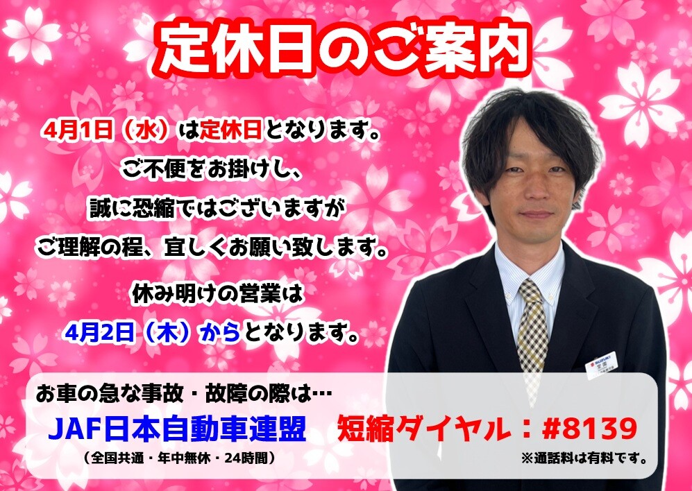 その他 2026.03.31 **定休日のご案内です** こんにちは♪ いつも大隅営業所の ホームページをご覧いただき ありがとうございます 今回は定休日のご案内です! 4月1日(水)は 定休日となります。 ご不便をお掛け致しますが、 ご理解の程、よろしくお願い致します。 また、休み明けの営業は 4月2日(木)からとなります! お車の急な事故・故障の際は JAF日本自動車連盟 短縮ダイヤル #8139 (年中無休・24時間・通話料有料) まで、宜しくお願い致します。