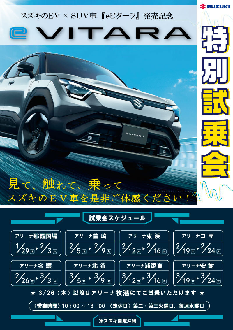 新車情報 2026.01.21 Eビターラ!!!! 皆様こんにちは! いつもブログを見ていただきありがとうございます 本日は試乗会のお知らせです!!!! ついに ついに あの Eビターラ 試乗できるようになりました スズキ自販沖縄 各拠点ごとに試乗会を開催していきます!!! ぜひ!この機会に!!!
