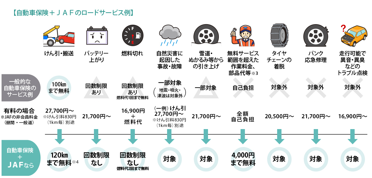 実は任意保険とJAFでは対応可能なサービスが異なります。