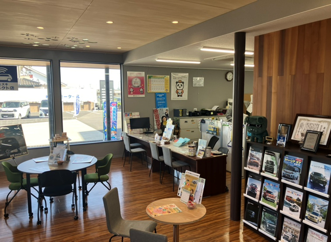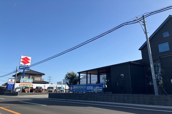 圏央道境古河ICから車で1分ほどのところにある自社指定工場完備の自動車販売店です。 お車の販売、修理のことなら当店へお任せください。 大きなスズキの看板が目印です。