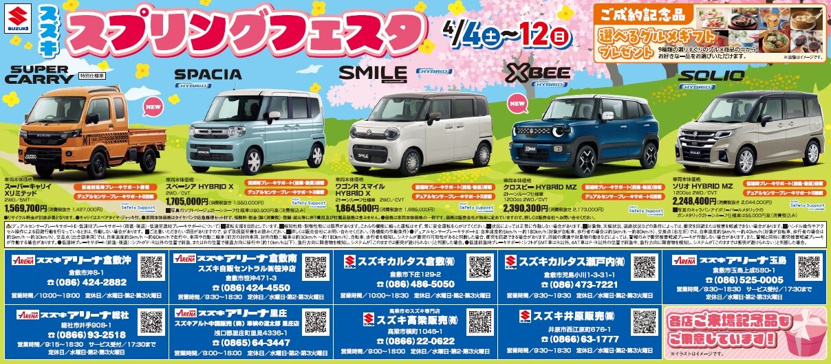 イベント/キャンペーン 2026.04.03 スプリングフェスタ 始まります! こんにちは いつもHPをご覧いただき ありがとうございます 4月になりましたね 気温もだいぶ暖かくなって 春の陽気が気持ちいですね さて そんな今週末からは スズキスプリングフェスタ 開催いたします! ご来場記念品 ご成約記念品 それぞれご用意して お待ちしております ぜひこの週末は スズキアリーナ総社を ご利用ください 皆様のご来店を 心よりお待ちしております