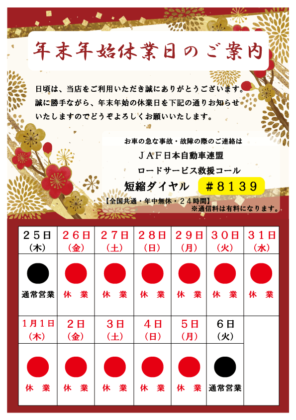 年末年始休業日のお知らせ