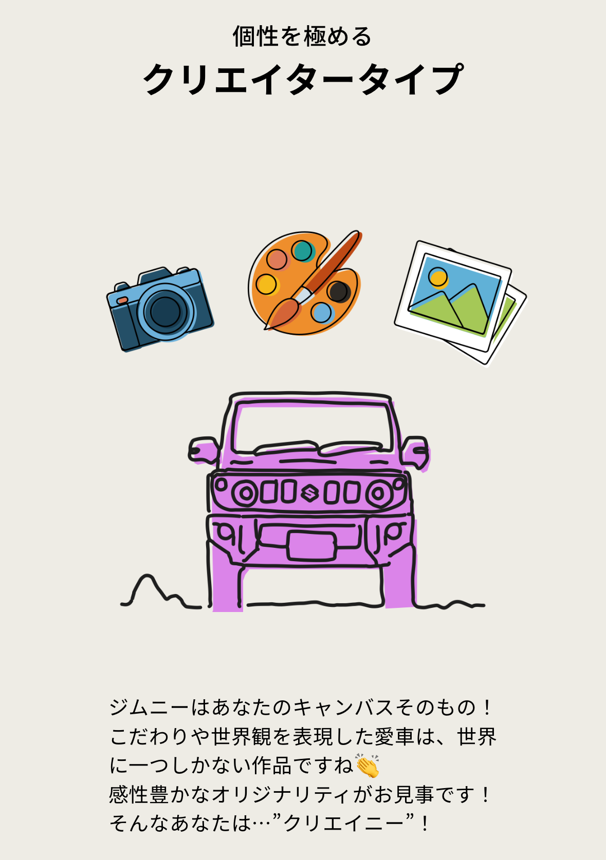 あなたのジムニーの楽しみ方をタイプごとに診断してくれます
