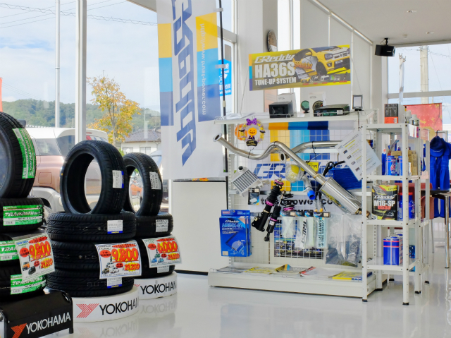 社外パーツ展示コーナーあり。