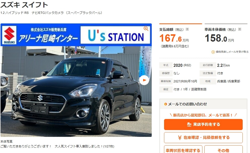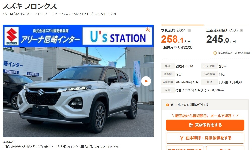 その他 2025.12.22 中古車紹介!! 中古車のご紹介です 今回は2台ご紹介させて頂きます 1台目はフロンクスです <<<<<年式は2024年(令和6年)>>>>> 走行距離はなんと25キロになります フロンクス 1.5 全方位カメラ/シートヒーター(兵庫)の中古車詳細 | 中古車なら【カーセンサーnet】 2台目はスイフトです <<<<<年式は2020年(令和2年)>>>>> 走行距離は2.2万キロになります スイフト 1.2 ハイブリッド RS ナビ/ETC/バックカメラ(兵庫)の中古車詳細 | 中古車なら【カーセンサーnet】