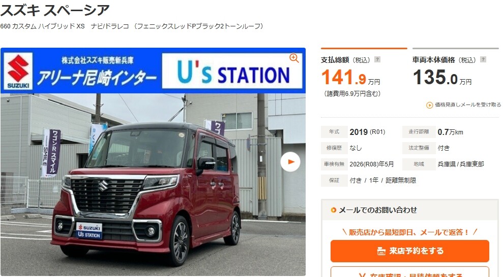 その他 2026.02.28 中古車紹介!!! 中古車紹介 スペーシアカスタムでございます <<<<<年式は2019年(R1年)>>>>> 走行距離は6875kmです スペーシア 660 カスタム ハイブリッド XS ナビ/ドラレコ(兵庫)の中古車詳細 | 中古車なら【カーセンサーnet】