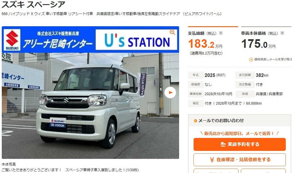 その他 2026.03.23 中古車紹介!!! 中古車紹介 スペーシア 車椅子でございます <<<<<年式は2025年(令和7年)>>>>> 走行距離は382キロです スペーシア 660 ハイブリッド X ウィズ 車いす移動車 リアシート付車 兵庫県限定/車いす移動車(兵庫)の中古車詳細 | 中古車なら【カーセンサーnet】