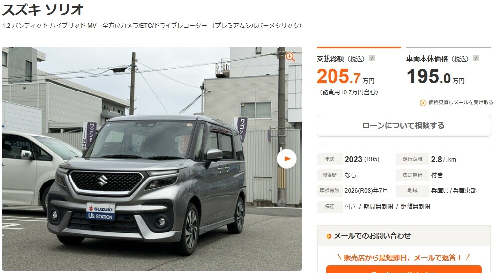 その他 2026.04.26 中古車紹介!!! 中古車紹介 ソリオバンディットでございます <<<<<年式は2023年(令和5年)>>>>> 走行距離は2.8万km ソリオ 1.2 バンディット ハイブリッド MV 全方位カメラ/ETC/ドライブレコーダー(兵庫)の中古車詳細 | 中古車なら【カーセンサーnet】