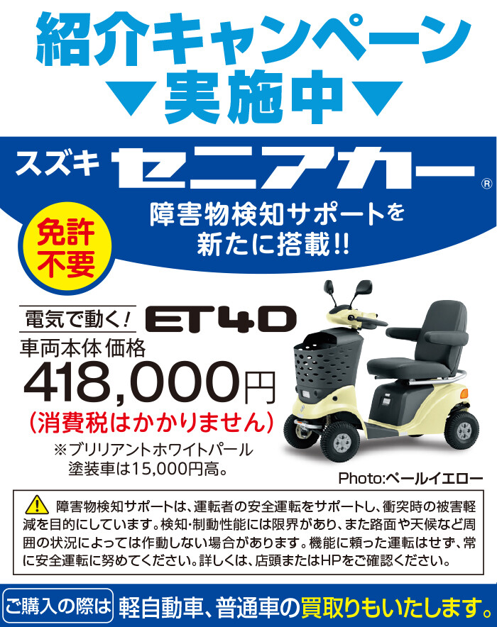 お車だけでなく、セニアカーをお考えの方はぜひスズキアリーナ調布中央店へお越しください