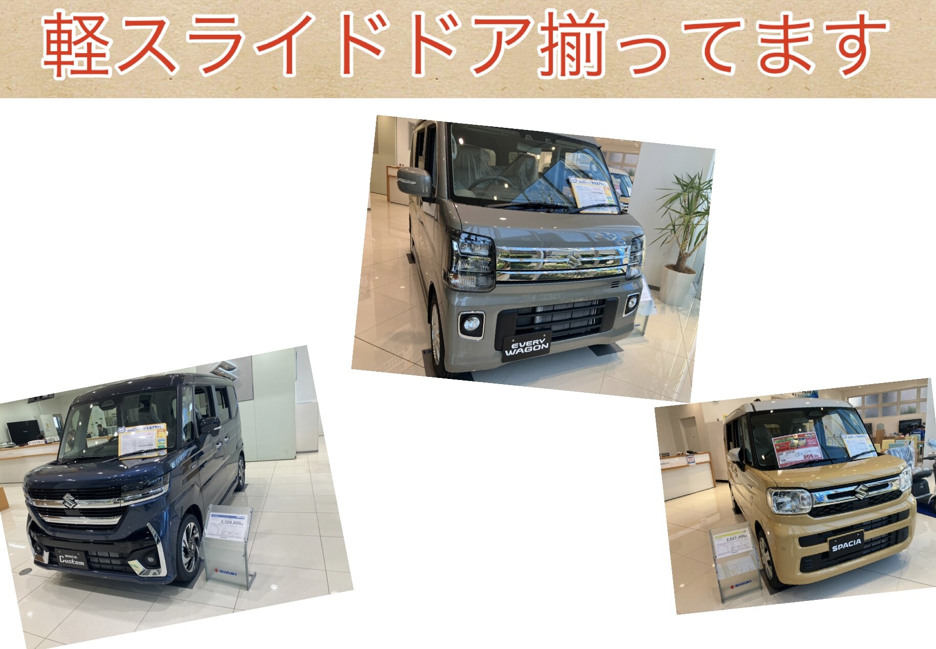 その他 2026.01.22 軽のスライドドアそろってます こんにちは 寒い日が続きますがいかがお過ごしでしょうか? 安見です 今日はタイトルそのまま 展示車が変わっています! そのお車は・・・ スペーシアカスタム エブリイワゴン スペーシア 軽スライド祭りです!!(?) 実車で比較できる機会は 珍しいです!! ぜひぜひこの機会に見に来てください