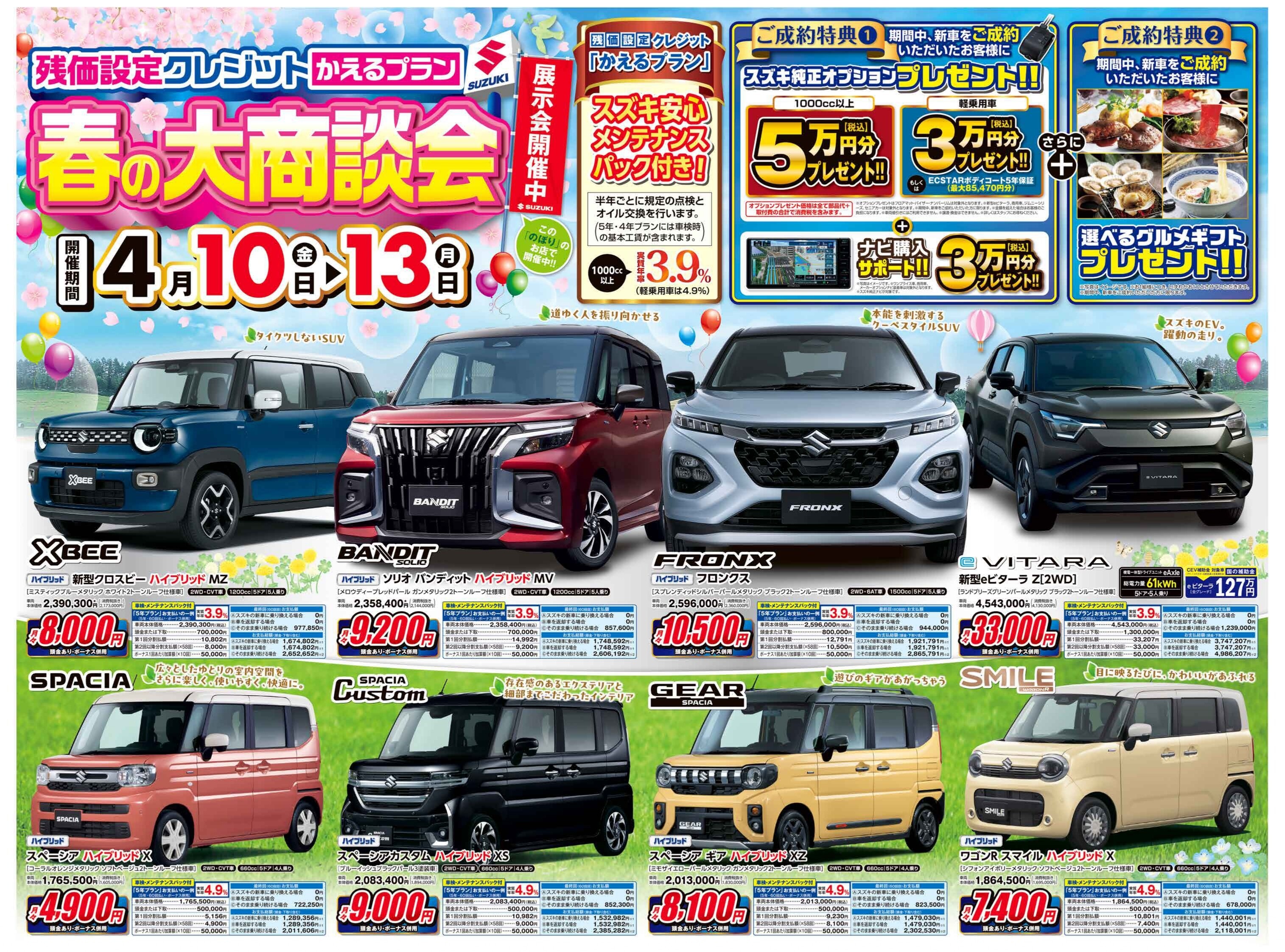 イベント/キャンペーン 2026.04.09 春の大商談会!!! みなさんこんにちは アリーナ佐賀東です いつもブログをご覧いただきありがとうございます 開催期間 4月10日(金)~13日(月) 期間中、新車をご成約いただいたお客様に スズキ純正オプションプレゼント! 1000cc以上 5万円分【税込】 プレゼント 軽乗用車 3万円分【税込】 プレゼント もしくは ECSTARボディコート5年保証 + 期間中、新車をご成約いただいたお客様に 選べるグルメギフト プレゼント ~春の大商談会~ ぜひご来店ください